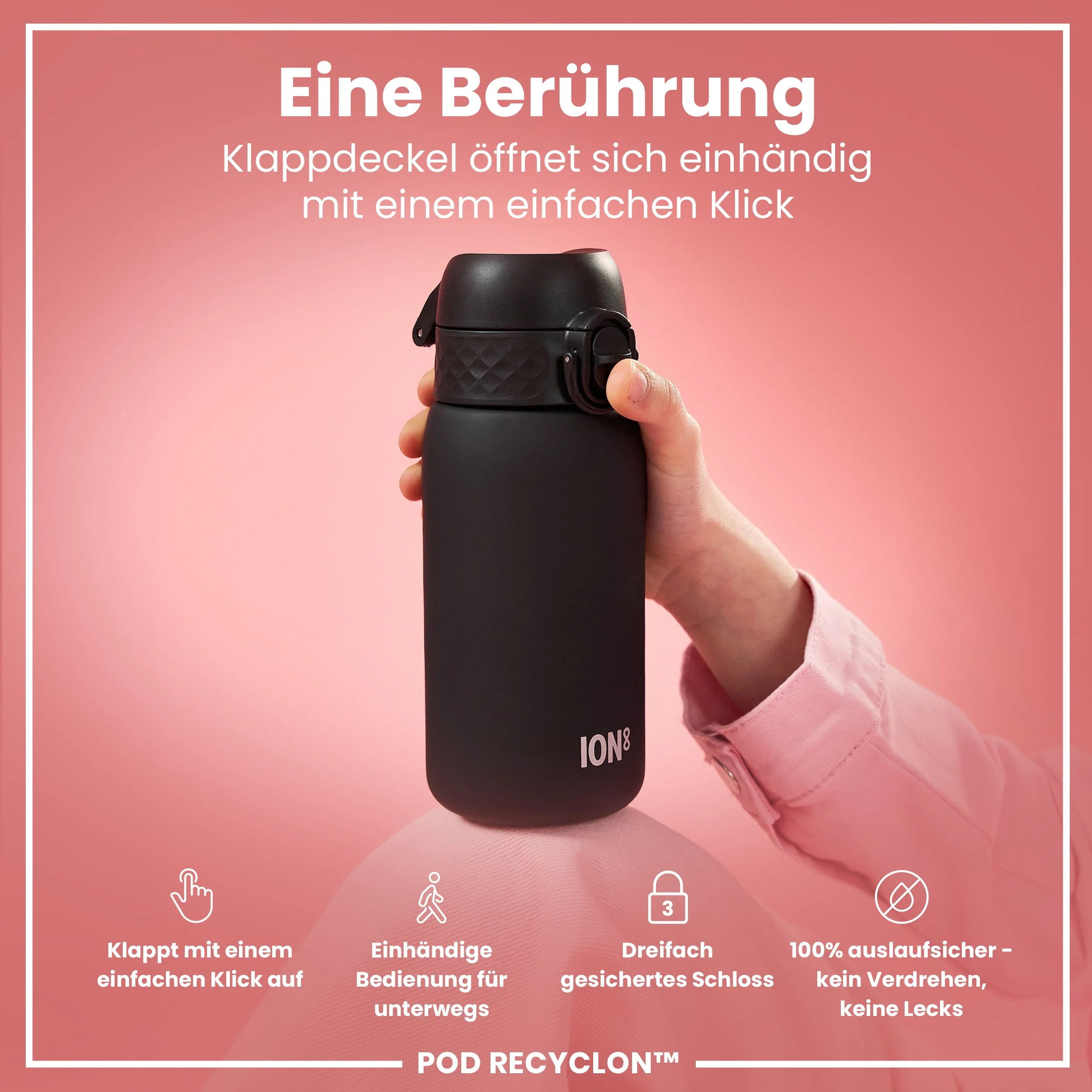 Hergestellt aus Recyclon™, einem transparenten, CO₂-neutralen Kunststoff, der teilweise aus Pflanzen besteht. Verantwortungsbewusst wiederverwenden und nachfüllen. Diese Trinkflasche ist lebensmittelecht, geruchsresistent, leicht zu reinigen und hält Getränke frisch und geschmackvoll.