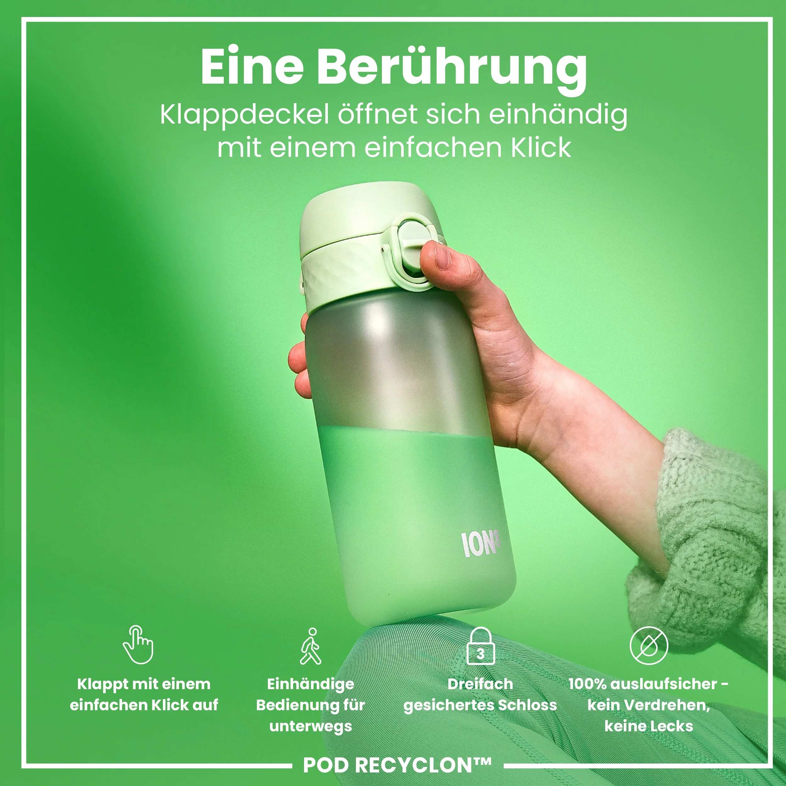 100 % auslaufsichere 400 ml / 13 oz BPA-freie Sport-Wasserflasche in Grün mit gleichmäßigem Trinkfluss für tropffreie Erfrischung und einem hygienischen, vollständig aufklappbaren Deckel für die Einhandbedienung unterwegs.