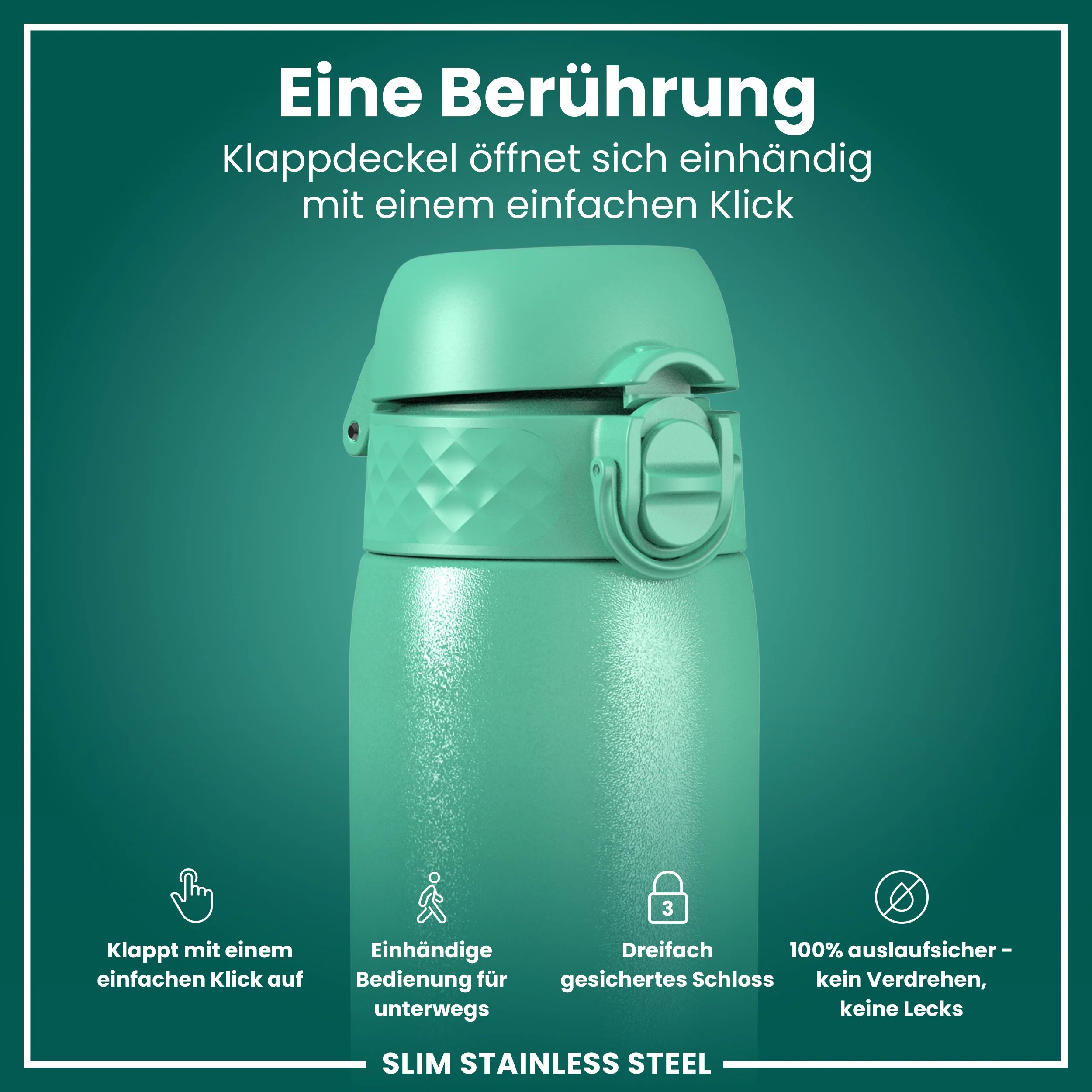100 % auslaufsichere 600 ml / 20 oz Trinkflasche aus Edelstahl mit gleichmĂ€Ăigem Trinkfluss fĂŒr tropffreie Hydration und einem hygienischen, vollstĂ€ndig aufklappbaren Deckel fĂŒr einhĂ€ndige Nutzung unterwegs.