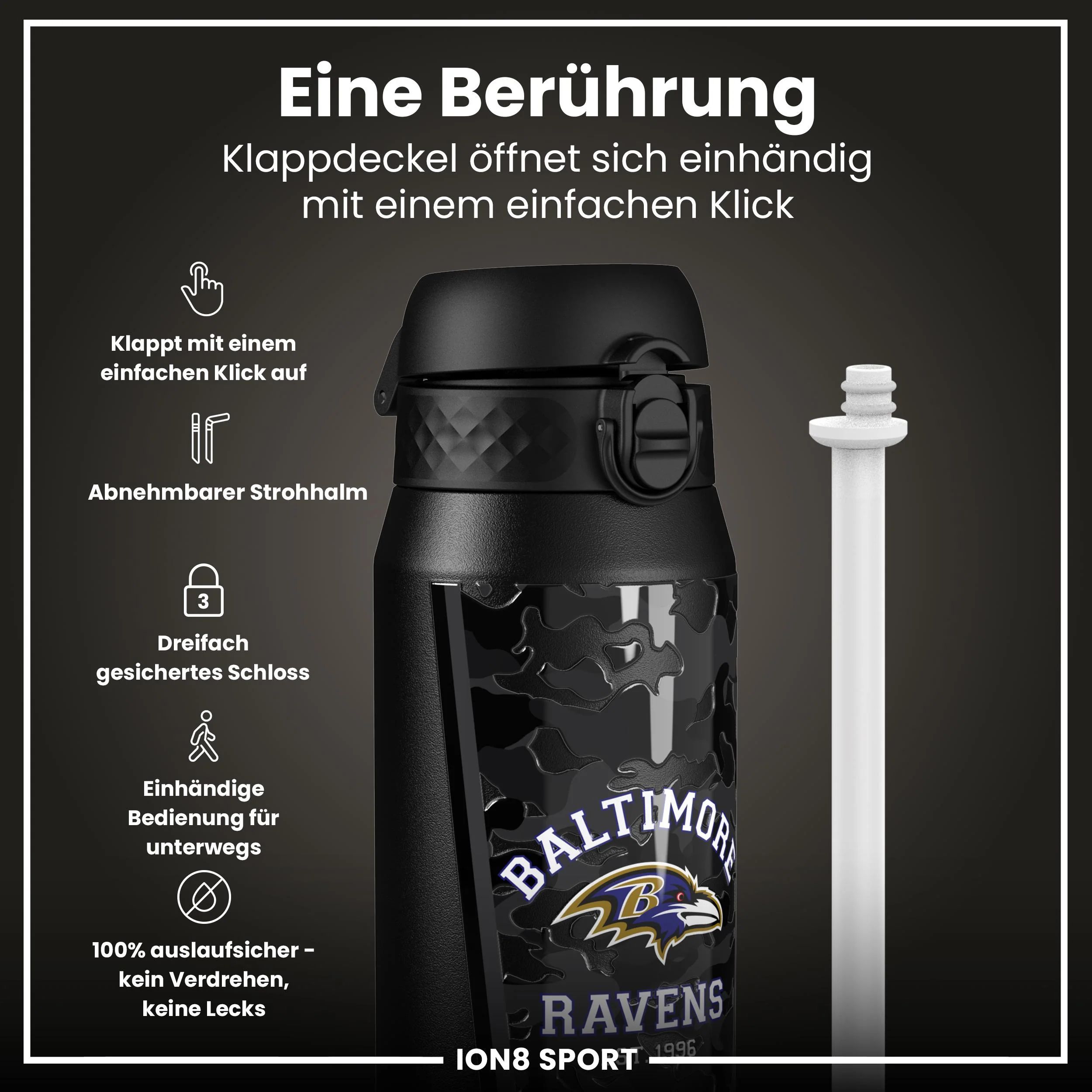 100 % auslaufsicher: Das zuverlässige Verriegelungssystem verhindert jedes Auslaufen – egal, wohin dich das Spiel führt.