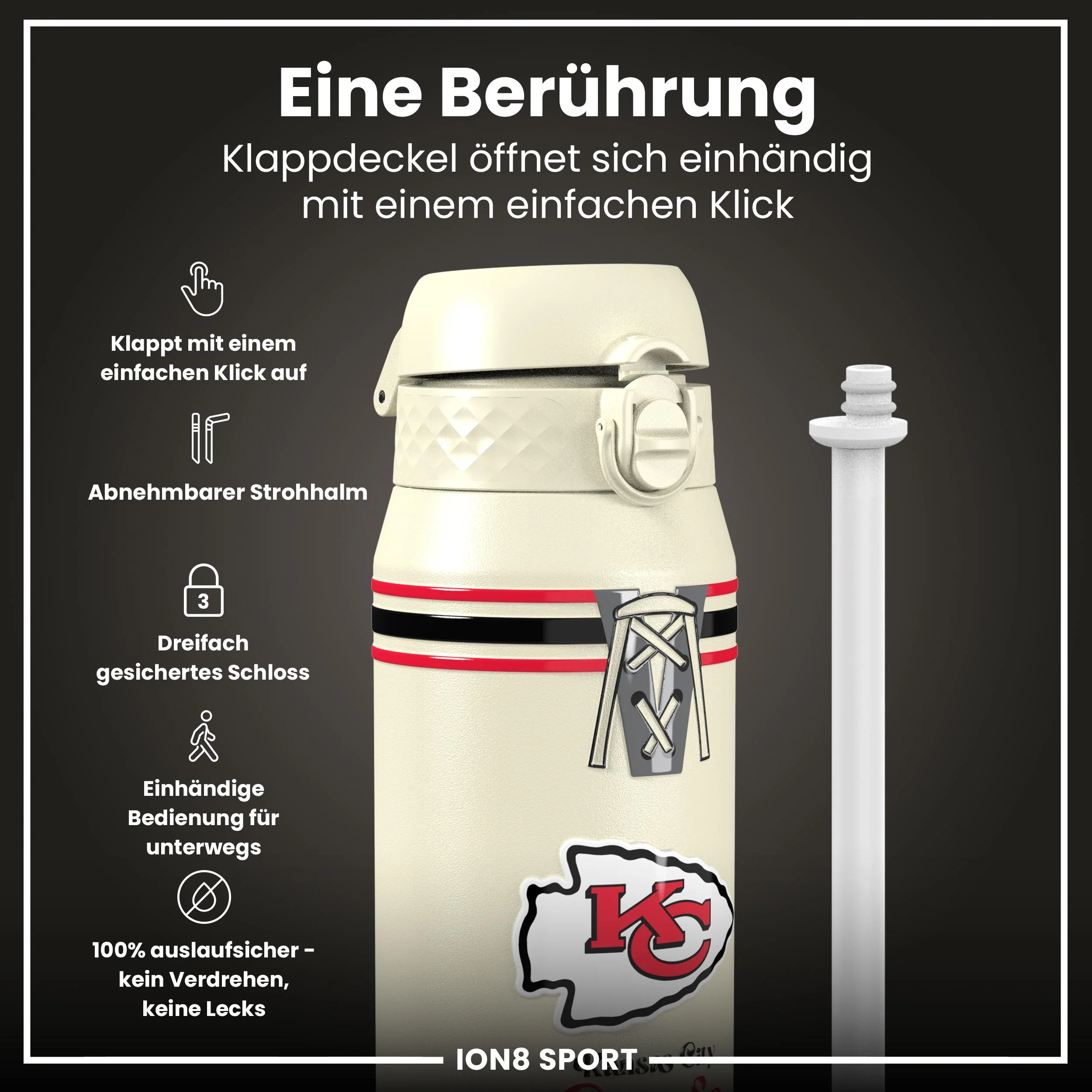 Steigere dein Spiel mit der offiziellen NFL Thermo-Isolierflasche von ION8. Entwickelt nach den kompromisslosen Standards der NFL, vereint diese 750 ml doppelwandige Edelstahlflasche herausragende Leistung mit unverkennbarem NFL-Stolz.